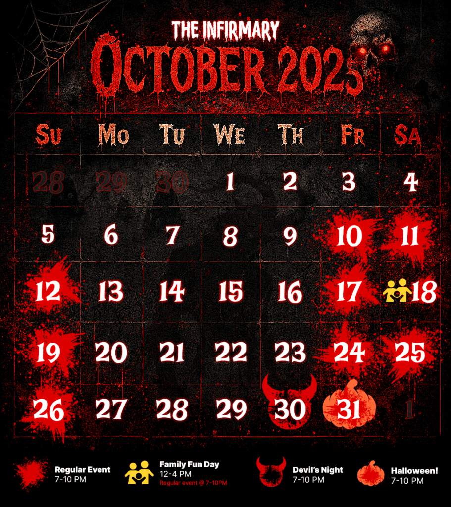 Plan your perfect night of terror by checking out our events calendar. With multiple dates and time slots running from October 10th to October 31st, you can choose the evening that works best for you — or come back for more than one night of screams.