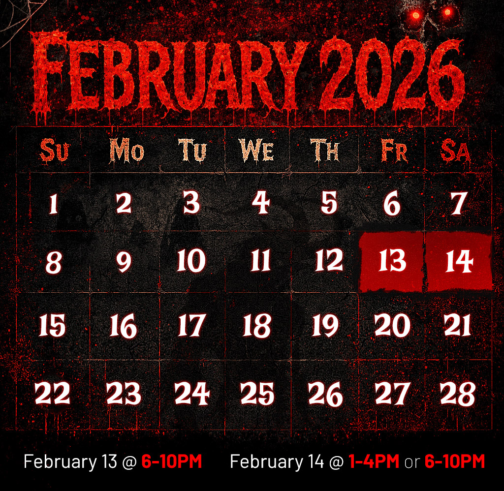 Plan your perfect night of terror by checking out our events calendar. With multiple dates and time slots running from February 13th to 14th, 2026, you can choose the evening that works best for you — or come back for more than one night of screams.